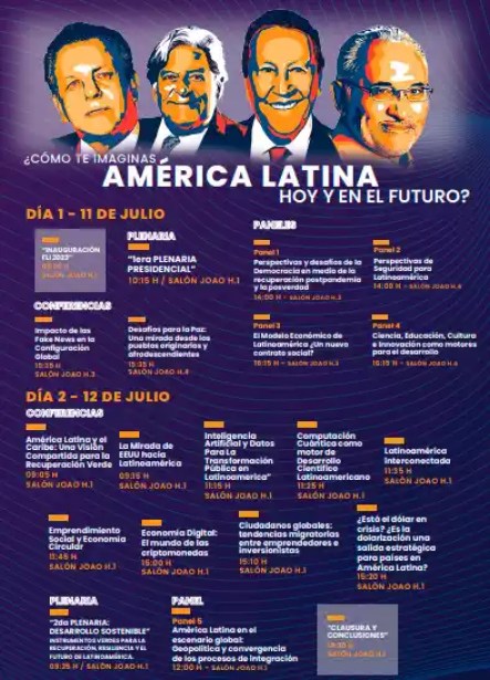 Otros temas que se debatirán en paneles durante el Foro son: “Perspectivas y Desafíos de la Democracia en medio de la recuperación postpandemia y la posverdad”, “Perspectivas de Seguridad para Latinoamérica”, “El Modelo Económico de Latinoamérica ¿Un nuevo contrato social?”, “Ciencia, Educación, Cultura e Innovación como motores para el desarrollo”, “América Latina y el Caribe: Una visión compartida para la recuperación verde”, “Desarrollo Sostenible: Instrumentos verdes para la recuperación, resiliencia y el futuro de Latinoamérica” y “América Latina en el escenario global: Geopolítica y convergencia de los procesos de integración”.
